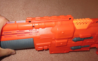 The round foregrip is quite comfortable to hold, being of decent length and width to provide a stable grip. It is however very far forward, a good ~11cm in front of the magwell, far more forward than most foregrips on Nerf blasters. I personally find it too far forward to use comfortably in a typical two-handed grip, however it is appropriately placed given the design of the source material.