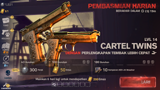 Mainkan Pembasmian harian untuk mendapatkan 300 perak , 50 Emas dan 10 Parts Senjata setelah membunuh zombie dengan jumlah tertentu , pembasmian harian ada setiap 24 jam sekali , setelah 7 kali anda akan meendapatkan 200 Emas secara Gratis